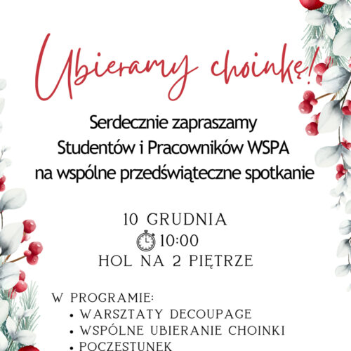 10 grudnia 2024 r. przy dźwiękach świątecznej muzyki w WSPA odbyły się warsztaty decoupage’u wraz ze wspólnym ubieraniem choinki. Warsztaty...czytaj dalej