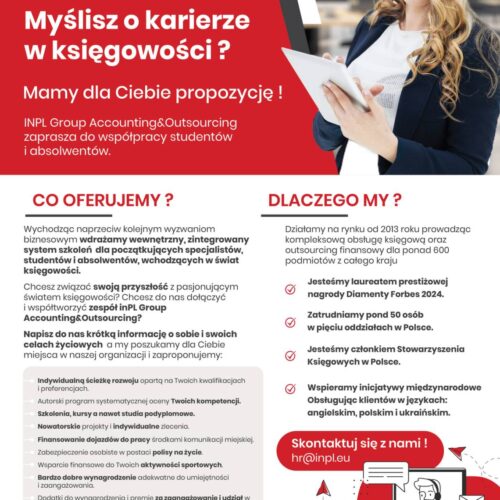 Myślisz o karierze w księgowości? INPL Group Accounting&Outsourcing zaprasza do współpracy studentów i absolwentów. Wychodząc naprzeciw kolejnym wyzwaniom biznesowym firma...czytaj dalej
