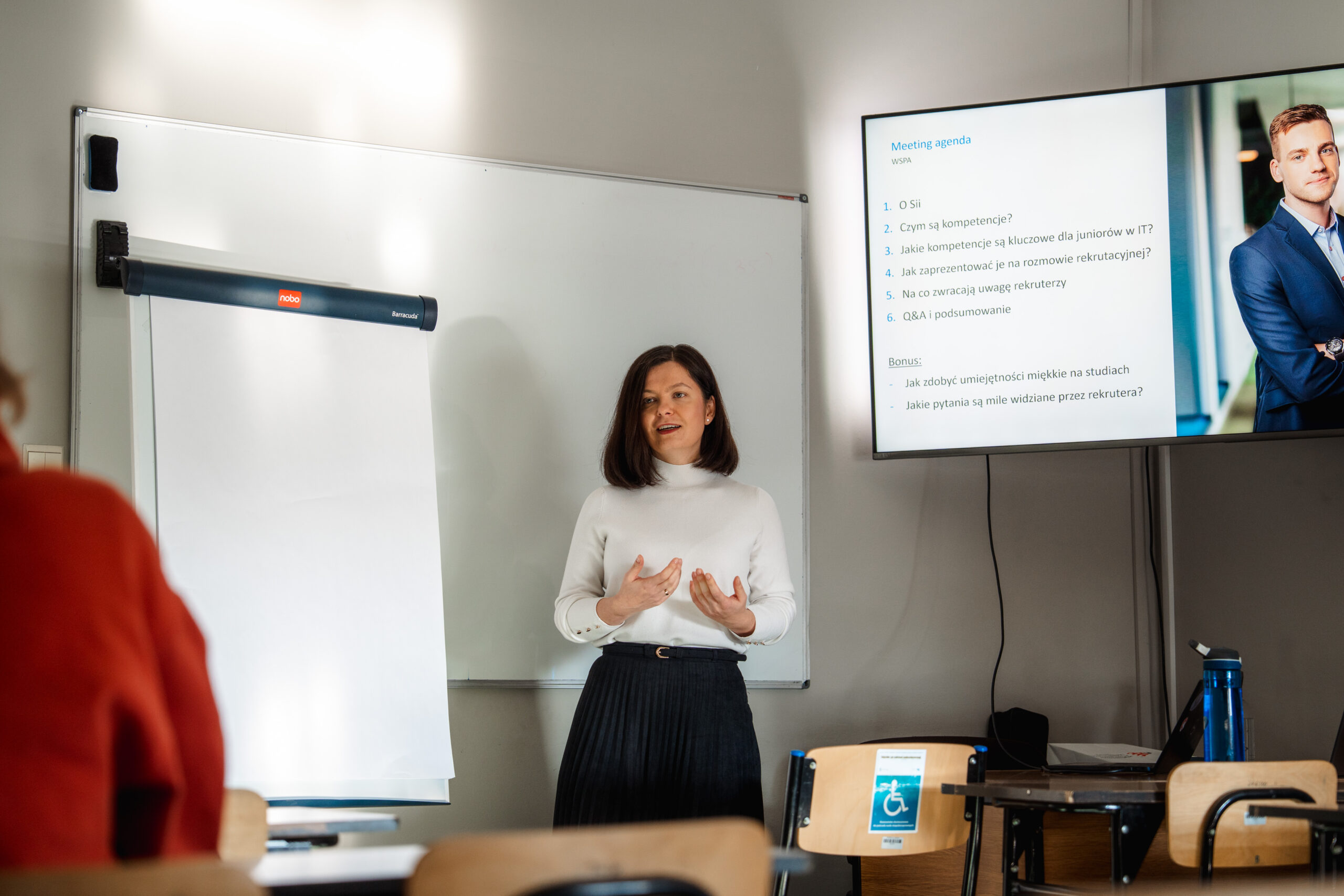 Program dnia koncentrował się na praktycznych aspektach budowania ścieżki zawodowej już na etapie studiów. Studenci uczestniczyli w warsztatach poświęconych m.in. kompetencjom miękkim w branży IT, pierwszym krokom na rynku pracy, autoprezentacji oraz rozmowom kwalifikacyjnym. Zajęcia pokazały, jak wiele czynników decyduje dziś o skutecznym starcie zawodowym i jak istotne jest świadome rozwijanie kompetencji jeszcze w trakcie kształcenia akademickiego.