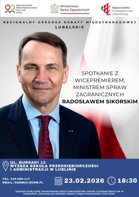 Szanowni Państwo, Regionalny Ośrodek Debaty Międzynarodowej 2026-2026 w woj. lubelskim oraz Fundacja Wspierania Edukacji i Przedsiębiorczości „INNOVATIV”, we współpracy z Ministerstwem Spraw Zagranicznych RP oraz Wyższą Szkołą Przedsiębiorczości i Administracji w Lublinie, mają zaszczyt zaprosić Państwa na wyjątkowe spotkanie z Wicepremierem,Ministrem Spraw ZagranicznychRadosławem Sikorskim. Wydarzenie będzie okazją do wysłuchania wystąpienia Pana Ministra poświęconego aktualnym wyzwaniom...Read More