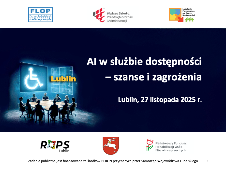 Wyższa Szkoła Przedsiębiorczości i Administracji w Lublinie, ul. Bursaki 12, LublinData: 25 listopada 2025 r.Miejsce: sala 223, Wyższa Szkoła Przedsiębiorczości i Administracji w Lublinie, ul. Bursaki 12Godziny: 10.00–16.45Grupa docelowa: kadra, wolontariusze i przedstawiciele instytucji zaangażowanych w rehabilitację społeczną osób z niepełnosprawnościami Opis wydarzenia Warsztaty poświęcone będą praktycznym aspektom wdrażania dostępności w uczelniach wyższych oraz roli rehabilitacji społecznej w procesie integracji osób z niepełnosprawnościami. Uczestnicy zapoznają […]
